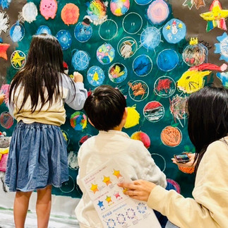 今回は、Xmasテーマに合わせて、カラフルなファミリーがクリスマスをお祝いするシーンを、7mの巨大黒板をキャンバスに、メインアーティストの稲川ひろみさんと一緒に作品を完成させました。