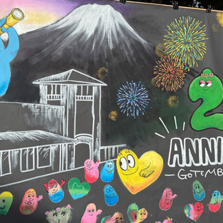参加型巨大チョークアートでは、御殿場の自然とショッピング施設をテーマにしたストーリー性ある作品を神田奈津江さん率いるアーティストチームが制作。御殿場プレミアムアウトレットの外観と富士山を背景に、夏の夜空に咲く花火をバーバパパファミリーが見上げる様子を描きました。子どもたちの手で彩られた色とりどりのバーバファミリーのモチーフがちりばめられました。