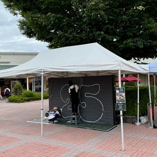 参加型の巨大チョークアートでは、アーティスト神田奈津江さん率いるチームとともに、中央に大きく描かれた「25」の数字の中を子どもたちの手形で彩りました。背景には雄大な富士山が広がり、夜空には花火が描かれ、夏の思い出を映し出すような迫力ある作品が完成しました。完成したアートの前では、多くの方が立ち止まり眺めたり、記念撮影を楽しまれる姿も見られました。