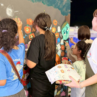 【参加型巨大チョークアート】では、メインアーティストの水野さとみさんをはじめとするアーティストチームとともに、子どもたちが大きな黒板キャンバスに挑戦しました。カボチャやおばけなどの可愛らしいハロウィンモチーフに加え、地元 愛知県出身アーティスト・青山哲士さんのイラストも登場し、にぎやかで楽しい雰囲気の中で作品が完成しました。