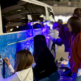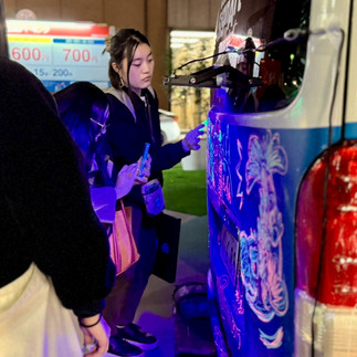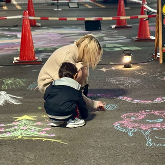 また、夜空に光るチョークアート号(黒板カー)も登場し、今回はいつものイベントよりもやや大人の来場者が多く、皆さま思い思いにアート制作を楽しまれていました。車体いっぱいに描かれた作品が光をまとい、会場の中でもひときわ目を引く存在となっていました。