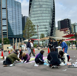 地面いっぱいに広がる巨大なストリートアートは、制作が進むにつれて次第に表情を変え、光とアートが融合した迫力ある空間を創り出しました。来場者の方々も足を止め、学生たちの真剣な制作の様子を熱心にご覧になっている姿が印象的でした。