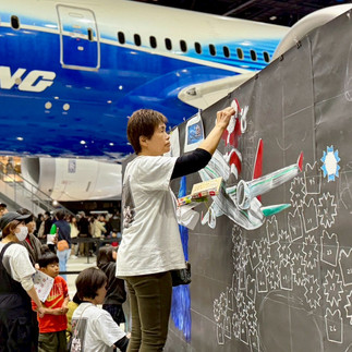 本イベントの大きな魅力は、実際に展示されているボーイング787初号機のすぐ横という、フライトパークならではの特別なロケーションでアート体験を行えた点です。巨大な飛行機を間近に感じられる迫力ある空間の中で、ここでしか味わうことのできない、貴重な時間となりました。