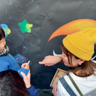 メインアーティストを務めたつるりさんが、ご自身の制作を進めながらも、子どもたち一人ひとりに寄り添い、楽しく描き方のポイントを伝えていました。会場には自然と笑顔が広がり、初めてチョークに触れる子どもたちも安心して制作に参加する様子が印象的でした。