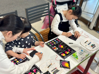 ②チョークアートのワークショップで「Xmasのオーナメント」の作品を描き上げます。